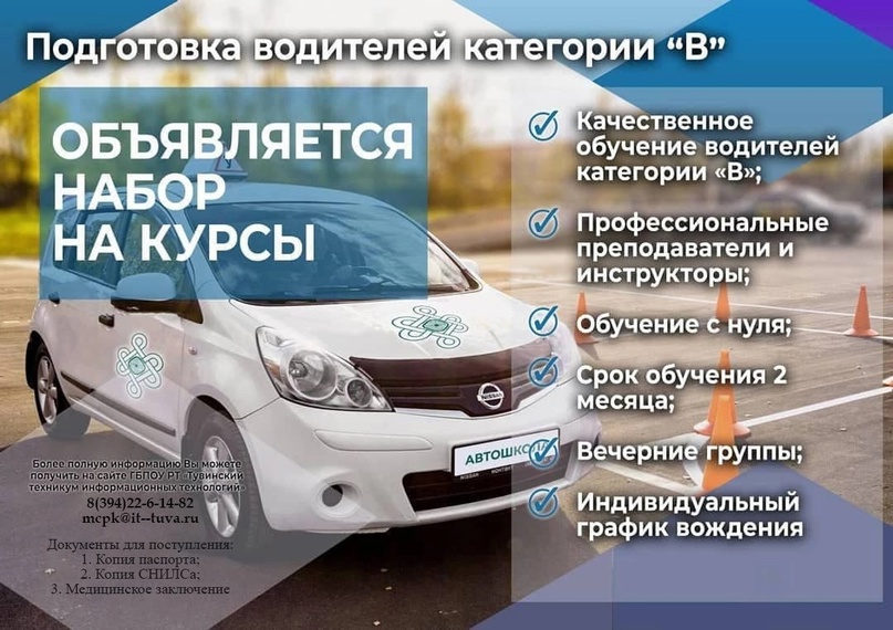С 12 сентября объявляется набор в автошколу при Тувинском техникуме информационных технологий категории «В».