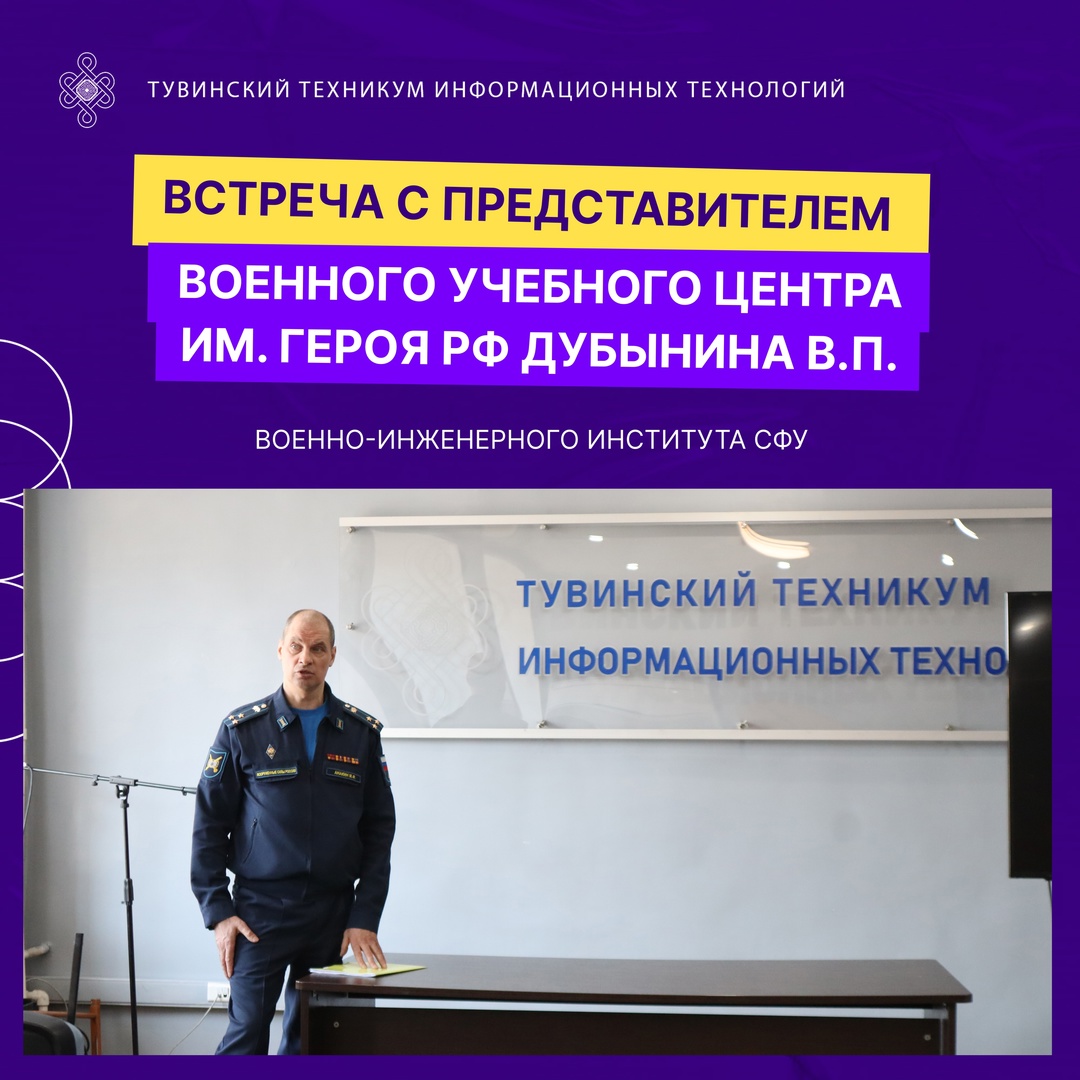 Сегодня состоялась встреча студентов с представителем Военного учебного центра имени Героя России, генерала армии Дубынина В.П., который функционирует при Военно-инженерном институте Сибирского федерального университета.